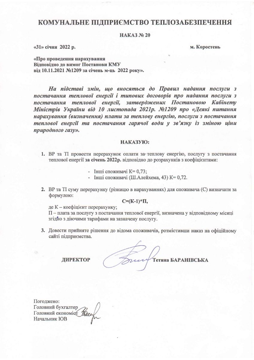 Наказ на перерахунки №20 від 31.01.2022 р.