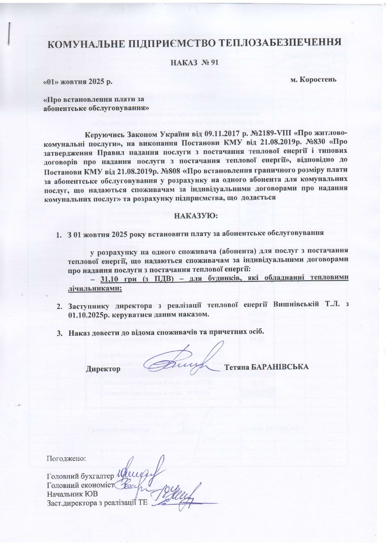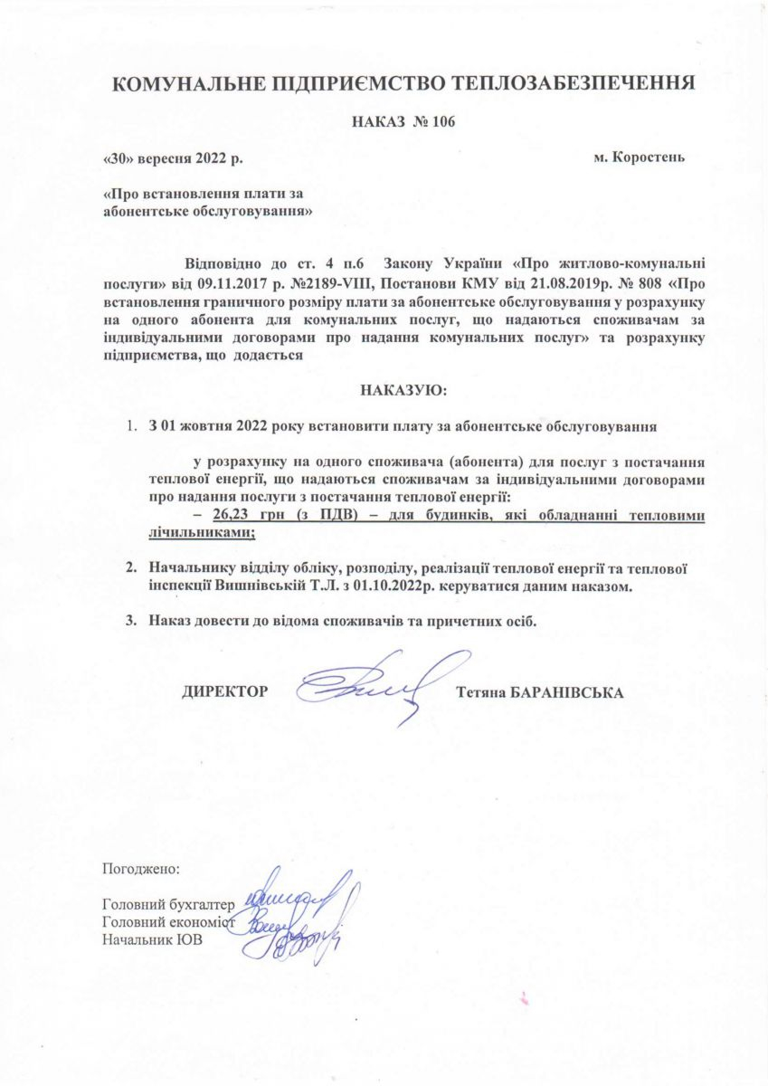 1. З 01 жовтня 2021 року встановити плату за абонентське обслуговування